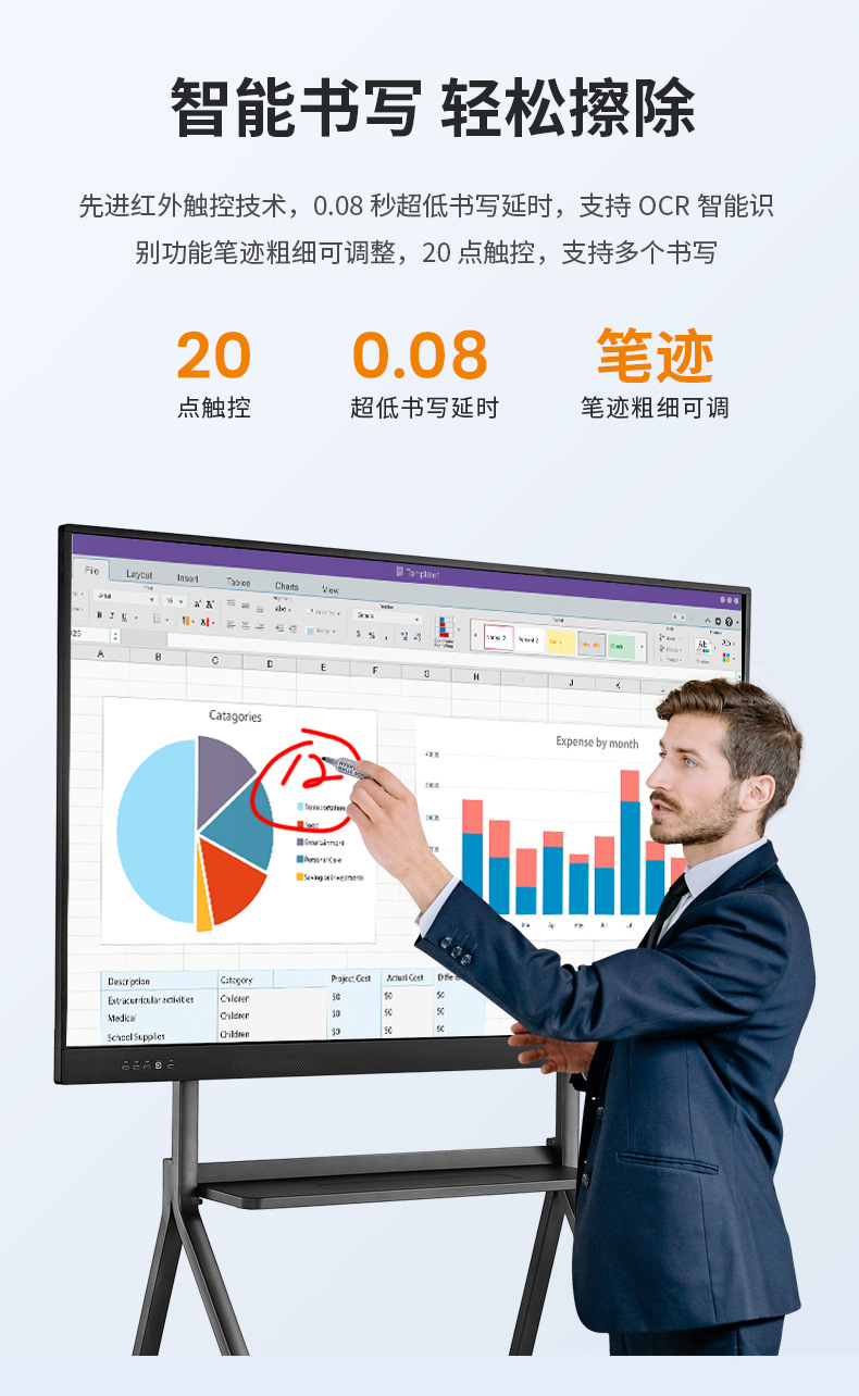 l 内置电子白板、无线投屏、全通道批注、扫码带走、输入显示、等众多实用功能,简单易用,可更高效提升教育、会议、工作效率,是款高端交互式一体机。